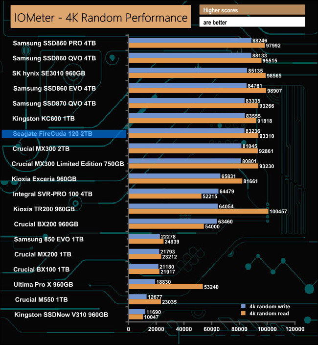 Officially the FireCuda 120 is rated as up to 100,000 IOPS for 4K random reads and up to 90.000 IOPS for writes. Using our own 4K tests we couldn't quite hit those official maximums with a read figure of 93,310 IOPS and 83,236 IOPS for writes.