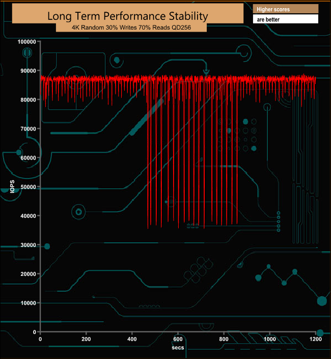 For the long term performance stability test, we set the drive up to run a 20-minute 4K random test with a 30% write, 70% read split, at a Queue Depth of 256 over the entire disk. The 2TB Seagate FireCuda 120 averaged 84,476 IOPS for the test with an excellent performance stability result of 95%.