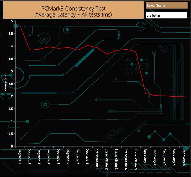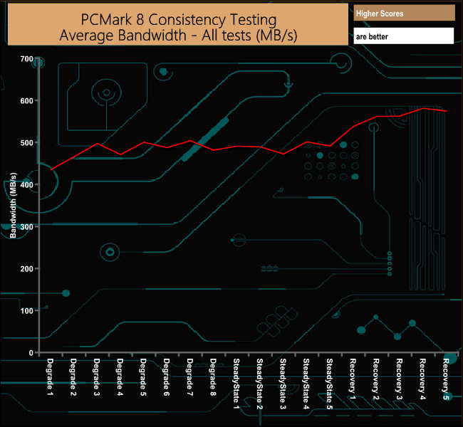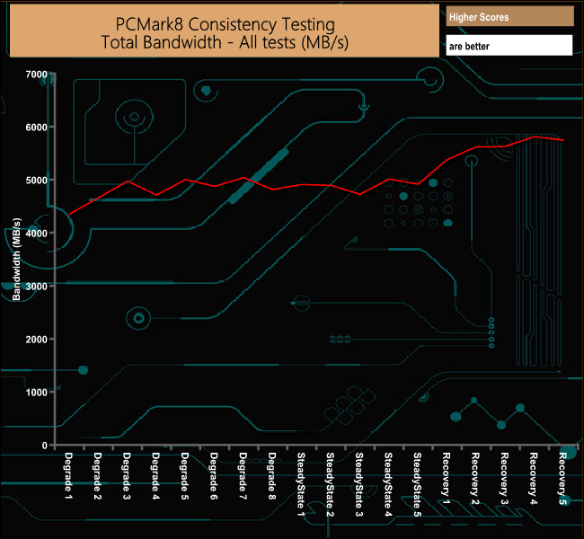 Seagate's FireCuda 510 handles the rigours of PCMark 8's Consistency Test rather well. Averaging 4,837MB/s total bandwidth for the Degradation and SteadyState phases and 5,635MB/s for the recovery phase.