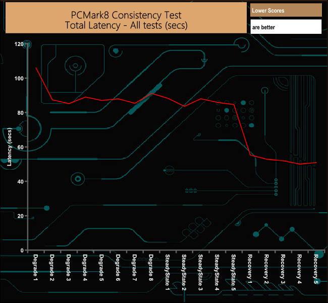 Futuremark’s PCMark 8 is a very good all round system benchmark but it’s Storage Consistency Test takes it to whole new level when testing SSD drives. It runs through four phases; Preconditioning, Degradation, Steady State, Recovery and finally Clean Up. During the Degradation, Steady State and Recovery phases it runs performance tests using the 10 software programs that form the backbone of PCMark 8; Adobe After Effects, Illustrator, InDesign, Photoshop Heavy and Photoshop Light, Microsoft Excel, PowerPoint, Word, Battlefield 3 and World of Warcraft. With some 18 phases of testing, this test can take many hours to run.