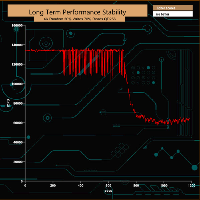 For the long term performance stability test, we set the drive up to run a 20-minute 4K random test with a 30% write, 70% read split, at a Queue Depth of 256 over the entire disk. The FireCuda 510 averaged 105,900 IOPS for the test with a performance stability of 78.18%, which is excellent for this class of drive.