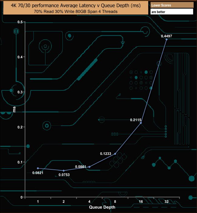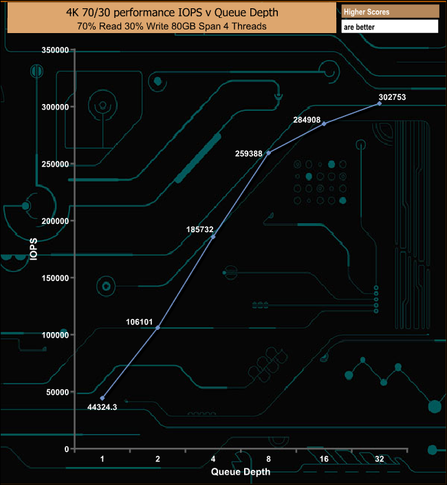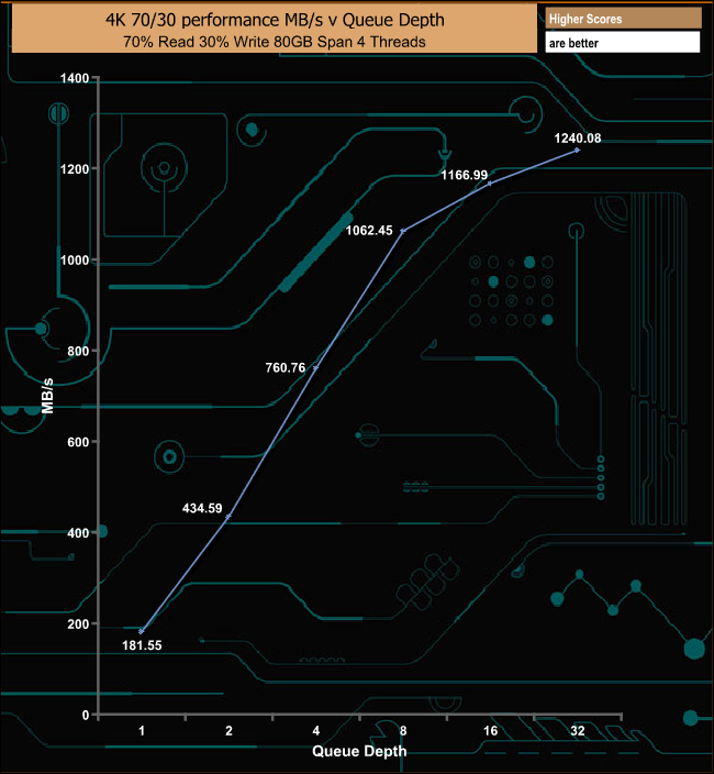The Seagate FireCuda 520 performed very well in our 70/30 read/write mixed test, finishing the test at QD32 with a figure of 302,753 IOPS (1,240.08MB/s).