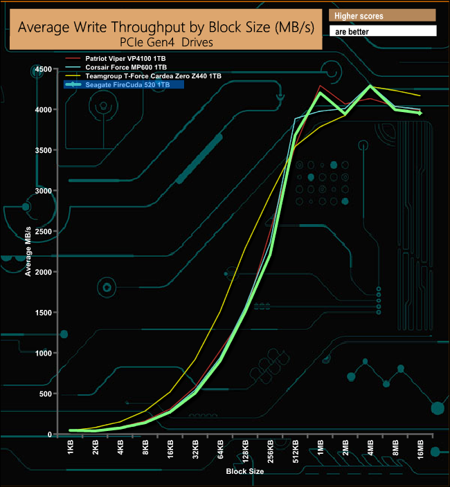 In our read throughput test, the Seagate FireCuda 520 performance peaked at 3,782.06MB/s, at the 8MB block mark.