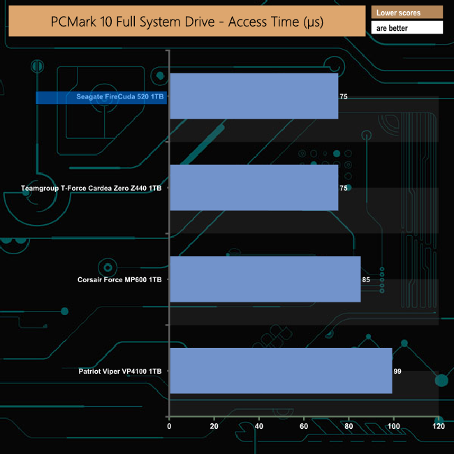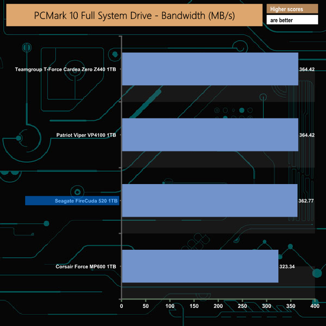 Seagate's FireCuda handles the PCMark 10 Full System Drive Benchmark very well producing the second-best overall score and third-best bandwidth figure of 362.77MB/s.