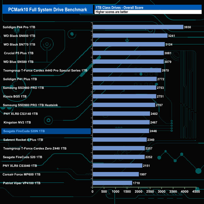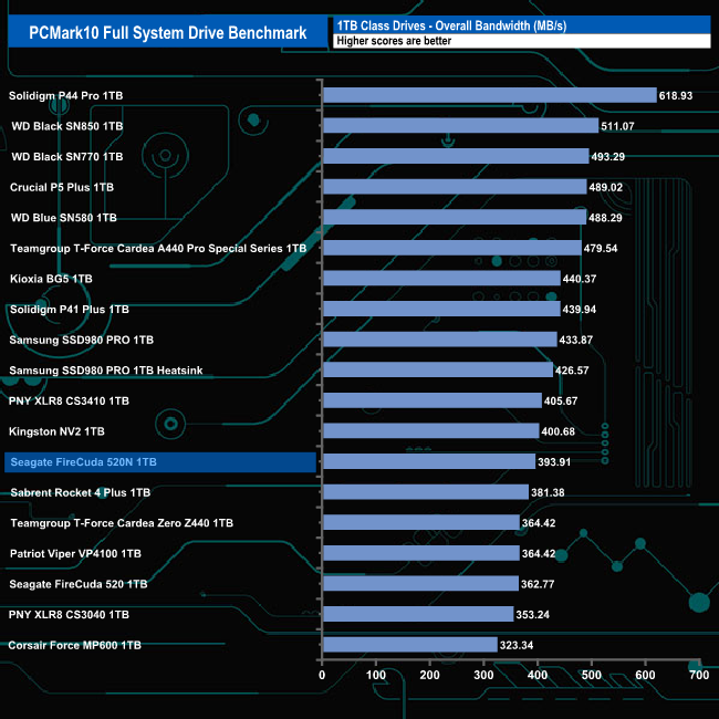 The 1TB Seagate FireCuda 520N produces an overall bandwidth figure for the benchmark of 393.01MB/s which sees the drive in the bottom half of the results chart.