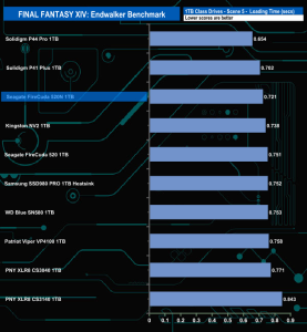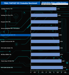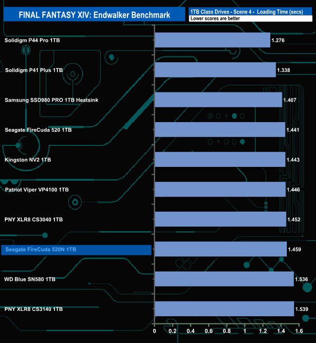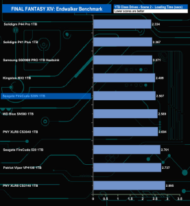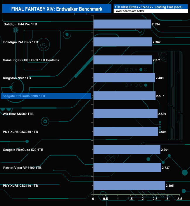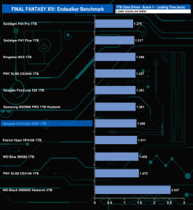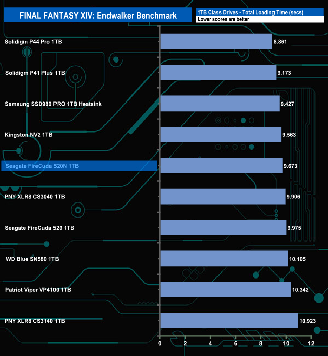 The Seagate FireCuda 520N handles the Final Fantasy XIV Endwalker Official Benchmark pretty well. It sits in fifth place on the Total Loading Time chart.