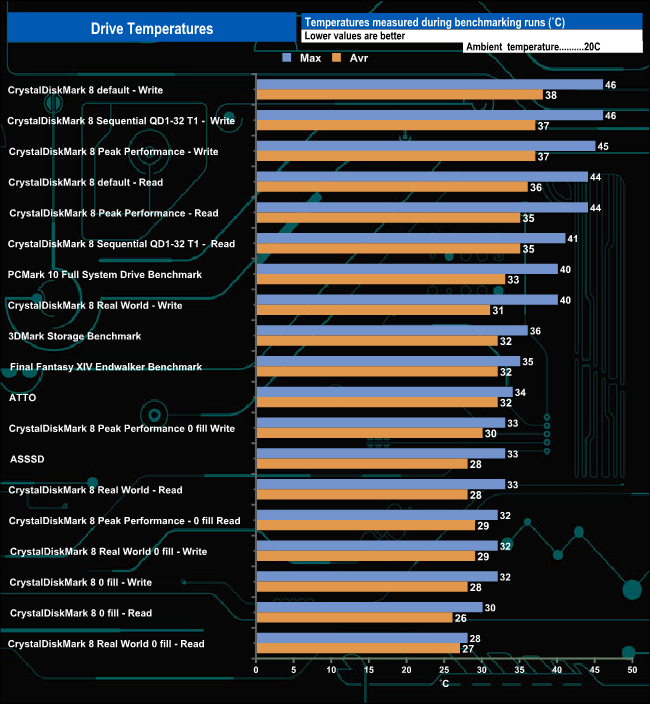 The Seagate FireCuda 520N doesn't have any type of heat spreader installed. To test the drive we used a Sabrent EC-PCIE enclosure which comes with its own aluminium heatsink and thermal padding to help keep any drive inside cool. The hottest the drive got was when it was being pushed hard during the CrystalDiskMark 8 default write and the Sequential T1 write tests where the drive hit 46° C, 24° under the quoted 70° C maximum operating temperature. For the non-4 K tests the drive averaged 37°C while for the 4K-based tests, the average was 35°C.