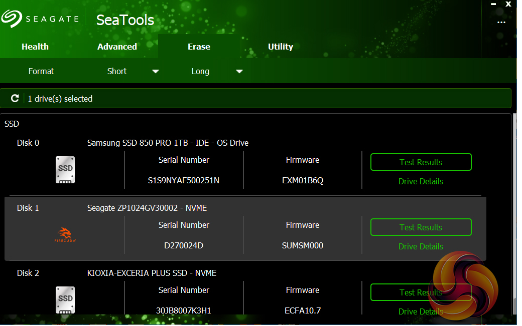 Seagate’s management software for the FireCuda is the SSD version of their SeaTools software. SeaTools SSD displays the drive’s health and supports firmware upgrading and secure erase. At first glance, it doesn't seem to be as feature-rich as some of its competitors but the devil is in the detail. Using a tab-based menu it has four main sections; Health, Advanced, Erase and Utility.