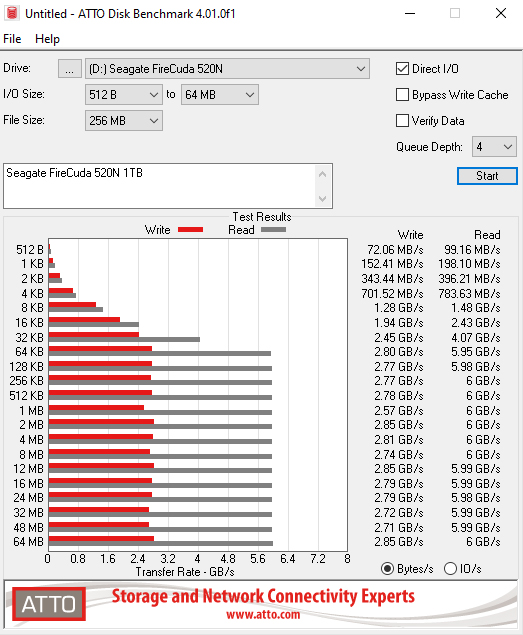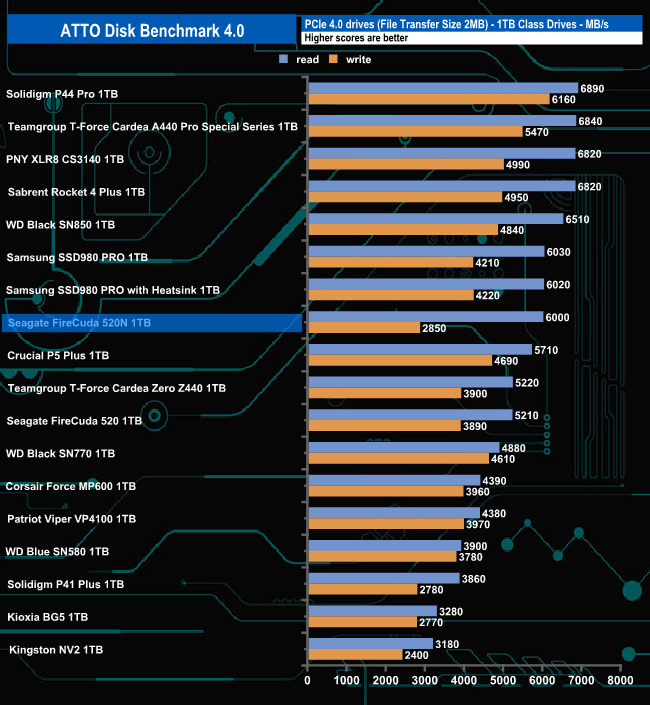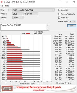 Testing the drive with the ATTO benchmark threw up some very odd results and ones that had us racking our brains for a while but then it clicked. Seagate rates the Sequential performance of the 1TB drive as up to 4,800MB/s for reads and up to 4,700MB/s for writes. The benchmark produced a read score of 6,000MB/s with a write of 2,850MB/s, so one score well over the official figure and one well under. ATTO uses compressible data by default and the controller firmware seems to prefer that to incompressible when it comes to Sequential reads but not writes.