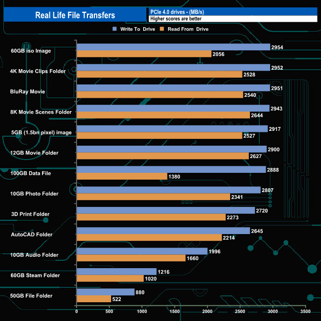 Switching over to an all NVMe storage environment we see write speeds of over 2GB/s for ten out of the thirteen tests, averaging 2,875MB/s for the ten with the fastest being the 2,954MB/s for the 60GB iso transfer. Reading the data back, the same ten tests averaged 2,313MB/s, the fastest being the 2,644MB/s for the 8K Movie Scenes transfer test.