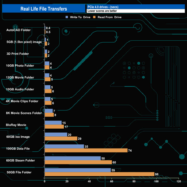 The Seagate FireCuda 530 handled our real-life file testing without displaying any real problems averaging 521MB/s writing the larger test files to the drive and 445MB/s when reading the data back again. The two slowest transfers were the 60GB Steam Folder (332MB/s write, 376MB/s read) and the 50GB file folder (234MB/s write, 314MB/s read).
