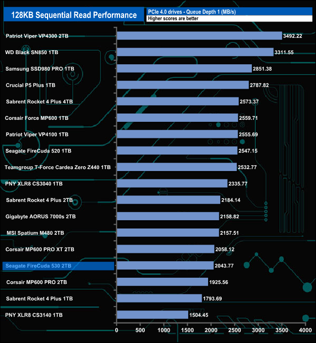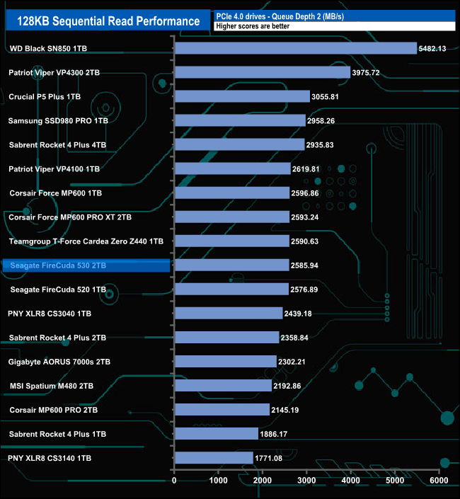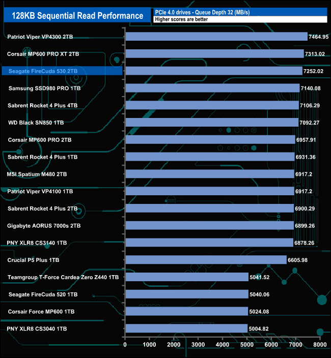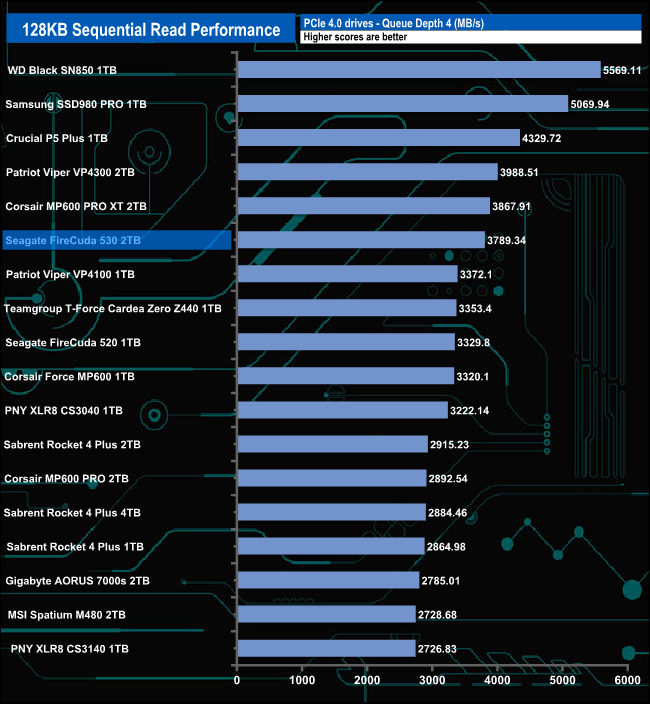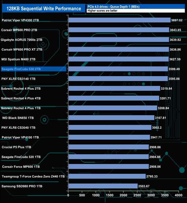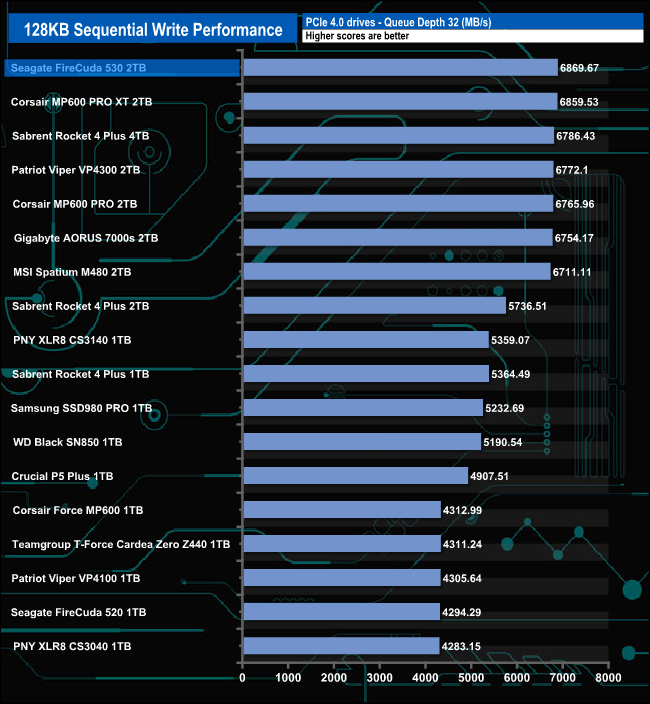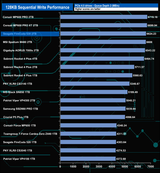 When it comes to Sequential write performance, the FireCuda 530 sits in sixth position in the results chart at QD1, moving up to third at QD2. At both QD4 and QD32, the drive sits on top of the pile. At all the tested queue depths the new drive is much faster than the previous generation FireCuda 520 when it comes to Sequential writes.
