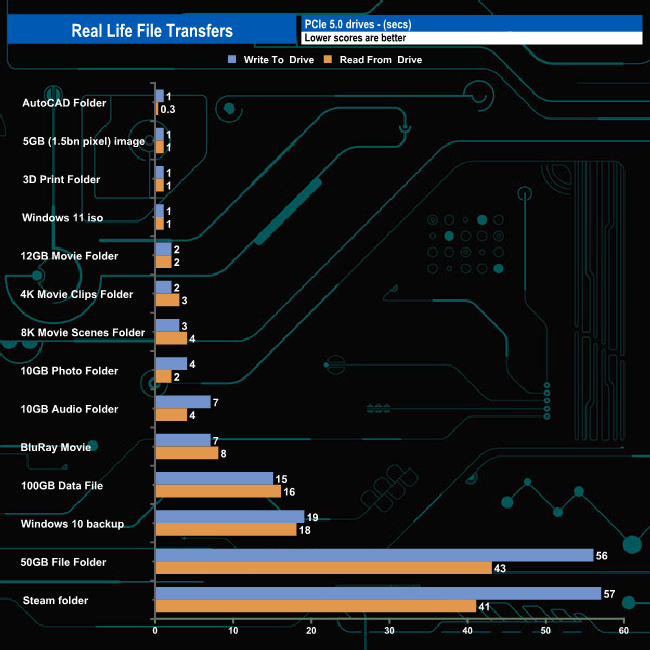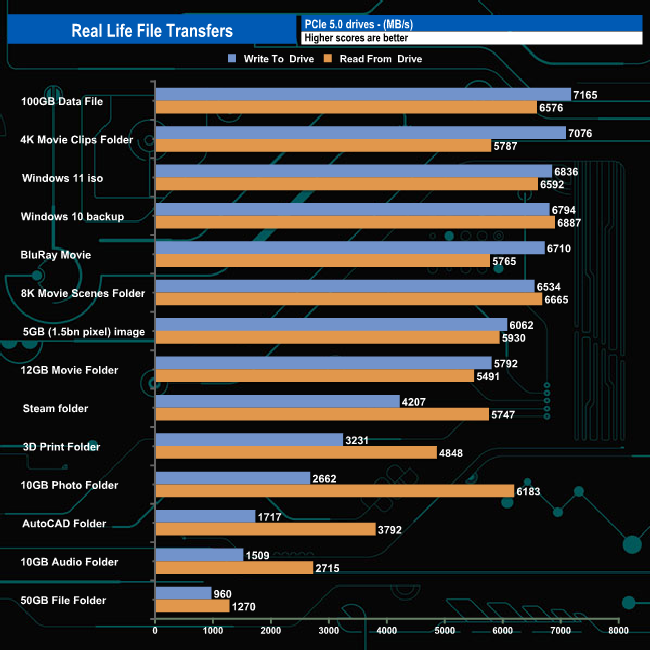 The drive averaged 4,803MB/s when writing the 14 transfer tests, with the fastest being the 7,165MB/s for the 100GB Data file transfer and the slowest being the 960MB/s for the 50GB file folder transfer. Reading back the data the average was a bit faster at 5,303MB/s. This time around the fastest transfer was for the Windows 10 backup at 6,887MB/s while the slowest was once again the 50GB file folder transfer at 1,270MB/s.