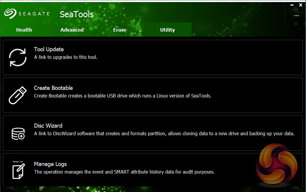 Seagate’s management software for the FireCuda is the SSD version of their SeaTools software. SeaTools SSD displays the drive’s health and supports firmware upgrading and secure erase. Although SeaTools SSD doesn’t come with any drive cloning utility built-in per se it does provide a link to download Seagate’s DiscWizard cloning software. It even gives you a choice of two themes, the standard one or one more suited to the drives gaming role.