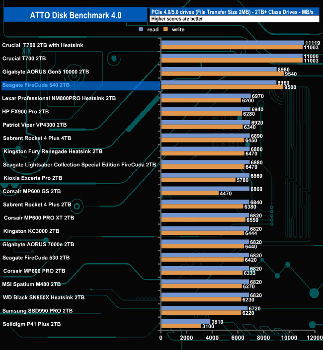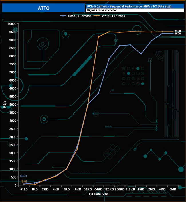 Using the ATTO benchmark we couldn't quite get to the official maximum Sequential figures of up to 10,000MB/s for both reads and writes, The best we saw from testing was 8,950MB/s for reads with writes a little faster at 9,500MB/s.