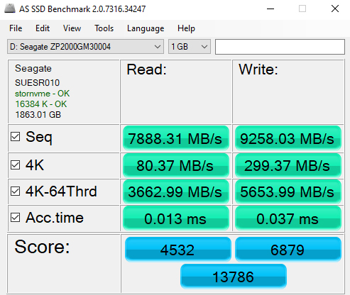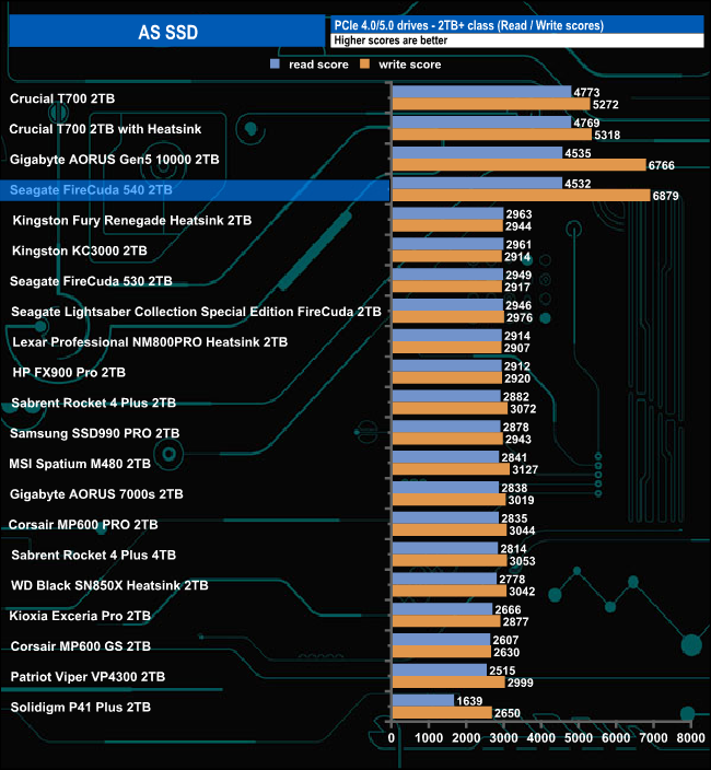 The AS SSD read score of 4532 sees the 2TB Seagate FireCuda 540 sitting in fourth place but it does have the best write score of all the Gen 5 drives tested to date.