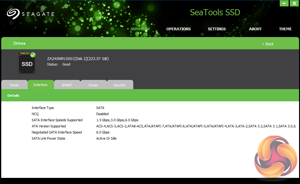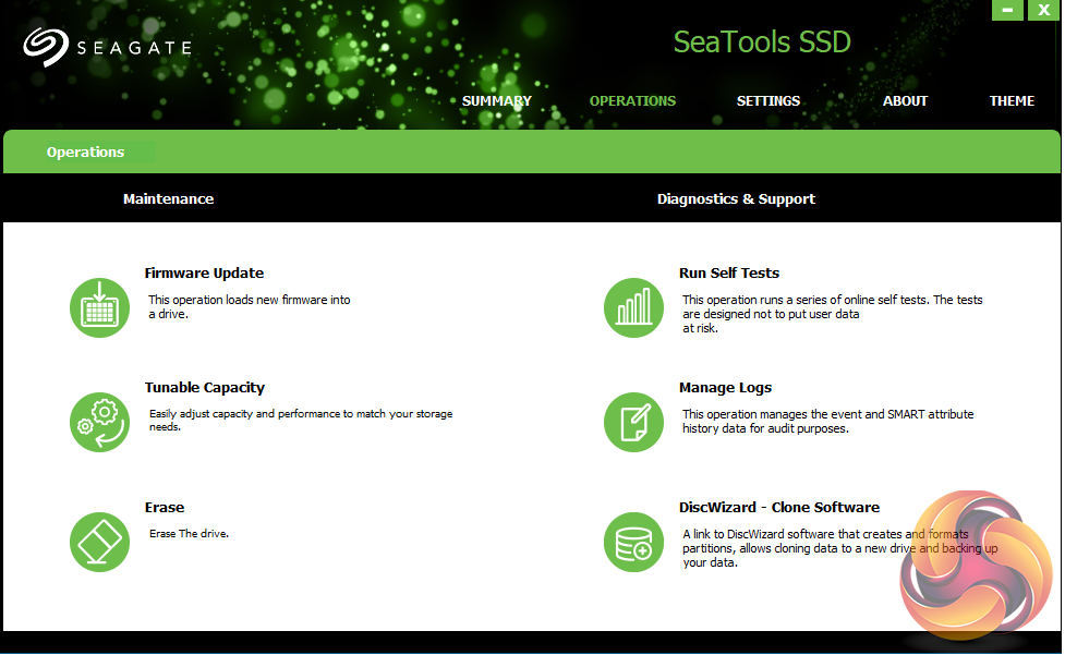 Seagate's SSD utility is SeaTools SSD. SeaTools SSD is a pretty comprehensive management tool that displays drive information including model, capacity, disk usage, temperature and remaining life. It also displays information about the SATA interface. It has an event log that can be exported and with it you can perform firmware updates. Firmware updates are done via the Operations page. Within this page you can also run drive diagnostics, and, if the drive supports it, switch between performance optimised and capacity optimised modes. There's also a link to Seagate's disc cloning software – DiscWizard.