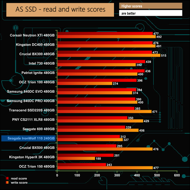 The read score of 312 places the IronWolf 110 in the bottom group of drives in our results chart. Its write score of 327 isn't as strong as some of the drives around it on the chart.