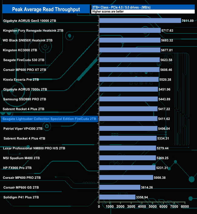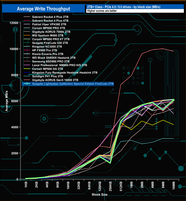 In our throughput test, the Lightsaber Collection Special Edition FireCuda which uses a FireCuda 530 is very oddly 212MB/s slower than the original FireCuda 530. It might be that the later firmware the Special Edition drive uses is having some effect on this test.