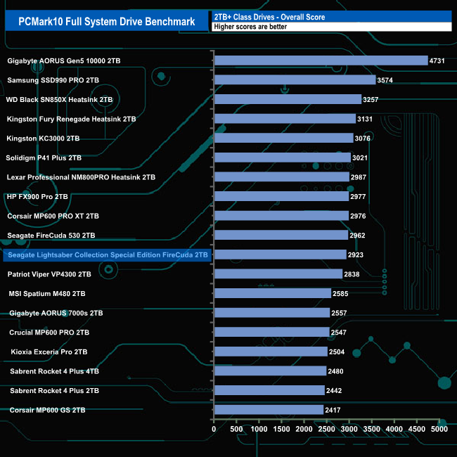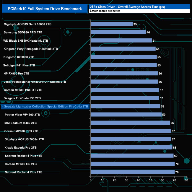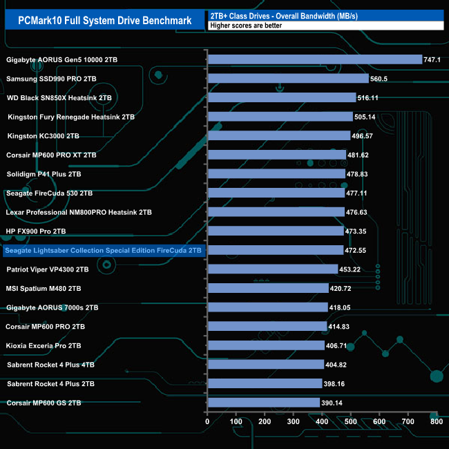 As you might expect for a fast performing Gen 4 drive Seagate's Lightsaber Collection Special Edition FireCuda handled the PCMark10 Full System Drive benchmark without any real problems. It was pretty consistent in the Adobe startup tests, averaging 234MB/s for the six tests. The 1,031MB/s result for the Adobe Photoshop (heavy use) trace was very good as was the 451MB/s for the Adobe After Effects usage trace. It also scored well in the three iso read/write (cp1, cp2 and cp3) test traces.