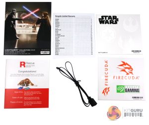 Seagate's Lightsaber Collection Special Edition FireCuda comes in a compact box with a small image of the drive and alternate faceplates on the front. Above the image to the right is the Star Wars logo and to the right there is a sticker which displays the capacity of the drive, its maximum Sequential speed (7,300MB/s) and the fact that the drive comes with Seagate's Data Rescue Service package. At the bottom right of the box is a logo showing the drive's RGB support. The rear of the box is covered by multilingual marketing notes.