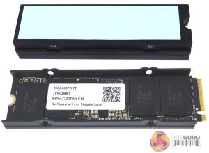 Four small screws hold the two-part heat sink together. The drive is a very snug fit so we didn't try to prise it out. The FireCuda 530 drive is built on a dual-sided 2280 M.2 format. One side of the PCB holds a Phison PS5018-E18 controller, four packages of 176-layer replacement gate B47R 3D TLC NAND and an SK hynix DDR4 (H5AN8G6NDJ, DDR4-2666) cache chip. The other side of the PCB has four more NAND packages and another DDR4 cache IC.