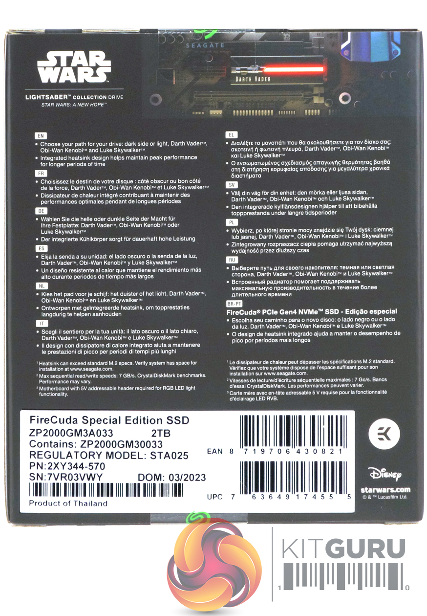 Seagate's Lightsaber Collection Special Edition FireCuda comes in a compact box with a small image of the drive and alternate faceplates on the front. Above the image to the right is the Star Wars logo and to the right there is a sticker which displays the capacity of the drive, its maximum Sequential speed (7,300MB/s) and the fact that the drive comes with Seagate's Data Rescue Service package. At the bottom right of the box is a logo showing the drive's RGB support. The rear of the box is covered by multilingual marketing notes.