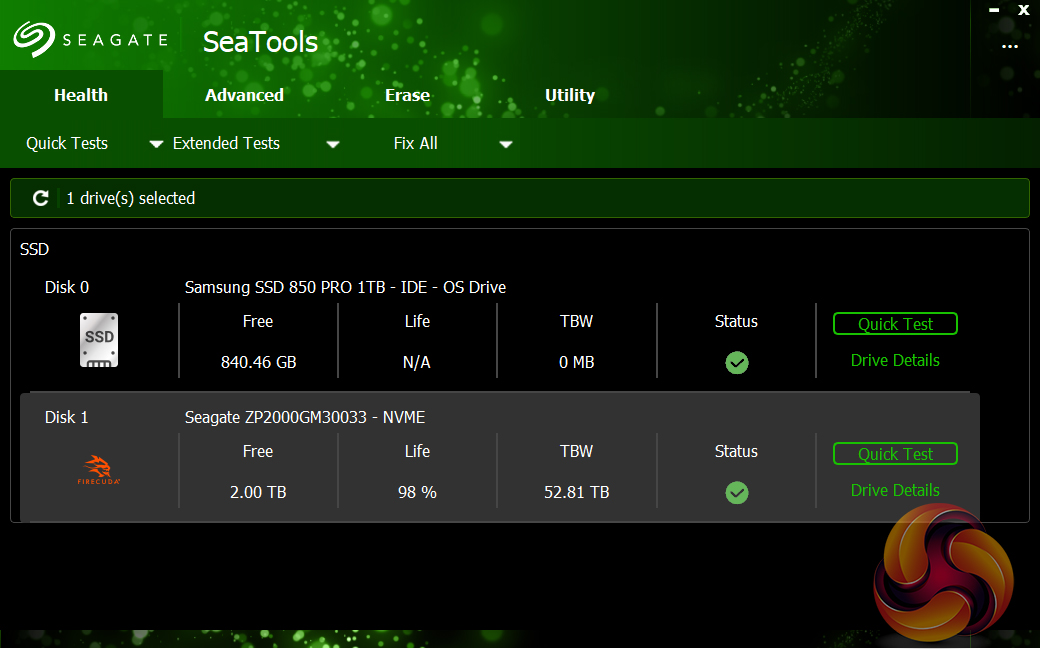 Seagate's drive management software utility is SeaTools. At first glance, it looks very basic but the detail is in the sub-sections for each of the four main tabs; Health, Advanced, Erase and Utility.