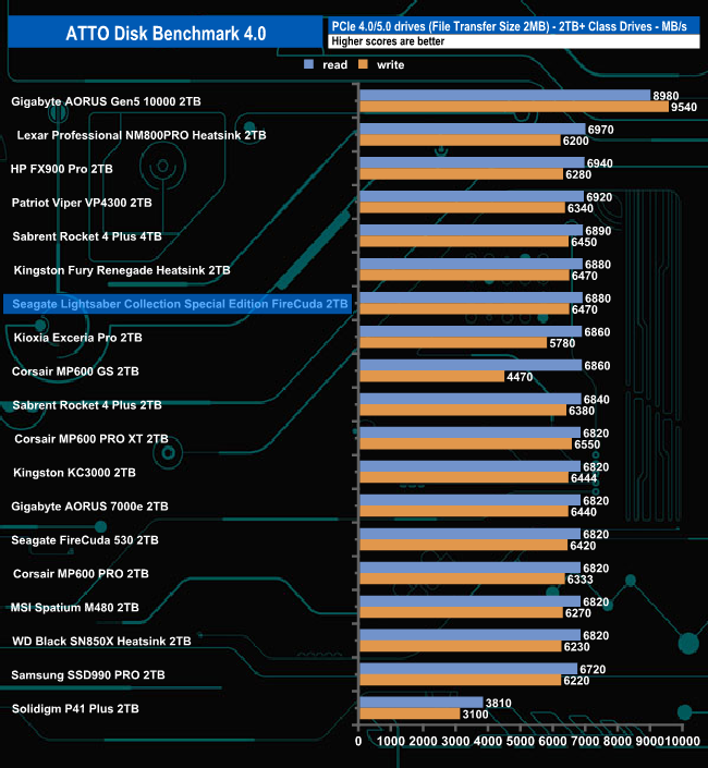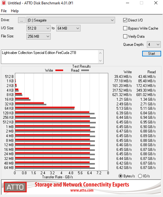 Seagate rates the Sequential performance of the 2TB version of the Lightsaber Collection Special Edition FireCuda as up to 7,300MB/s for reads and up to 6,900MB/s for writes. Using the ATTO benchmark we couldn't quite hit the maximums for the drive with tested read and writes figures of 6,880MB/s and 6,470MB/s respectively.