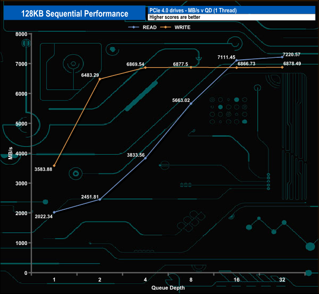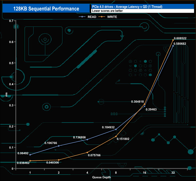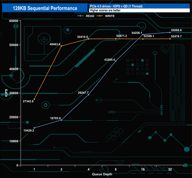 We used CrystalDiskMark 8‘s custom settings to test the Sequential read and write performance of the drive through a range of queue depths. The setup for the tests is listed below.