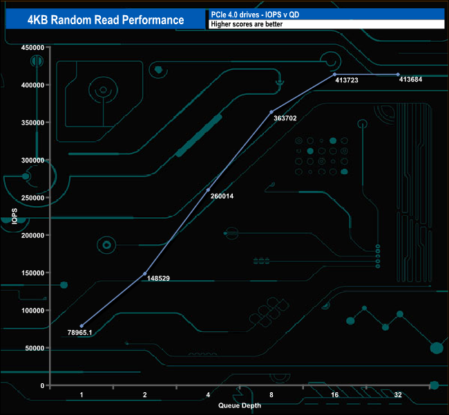 We used CrystalDiskMark 8‘s custom settings to test the 4K random read performance of the drive through a range of queue depths. The setup for the tests is listed below.