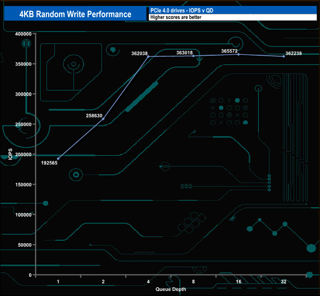 The fastest 4K random write performance we saw from our four threaded testing was 365,572 IOPS which came at the QD16 mark. The drive's performance then dropped back to finish the test run at 362,238 IOPS (QD32). Both of these figures are nowhere near the official 1,000,000 IOPS maximum.