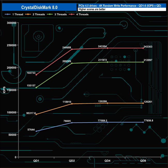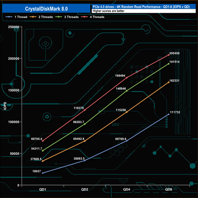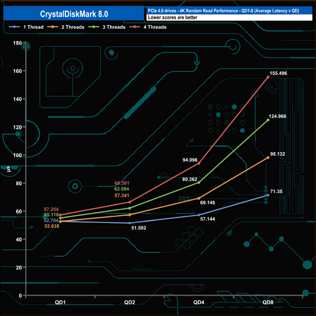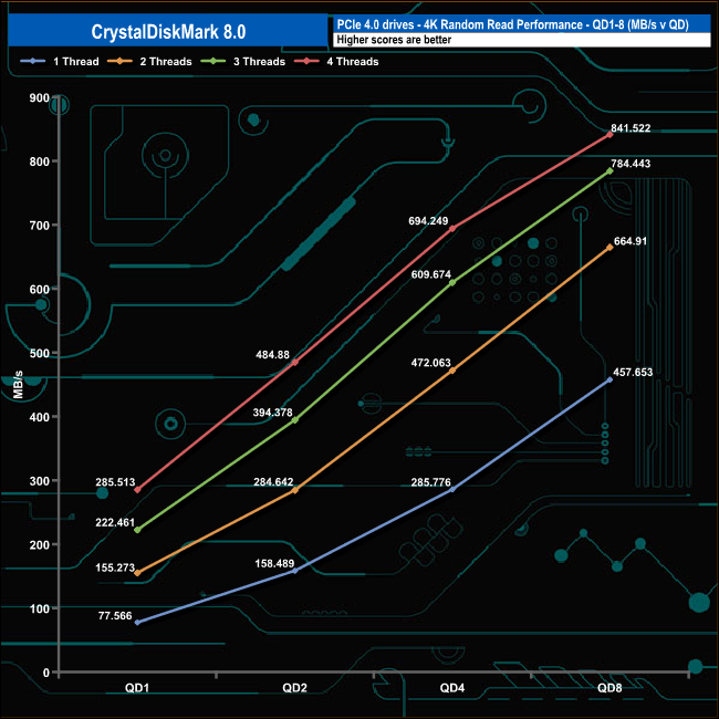 We used CrystalDiskMark 8 to test the random performance of the drive at lower queue depths (QD1 – QD8 where most of the everyday workloads occur) using 1 to 4 threads.
