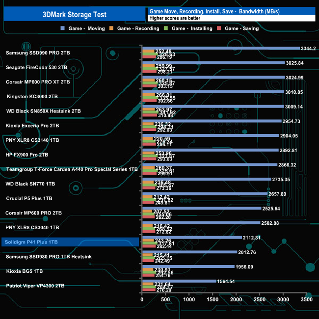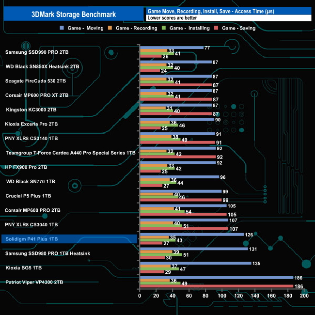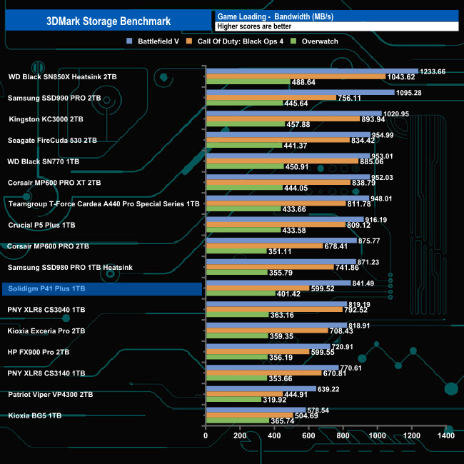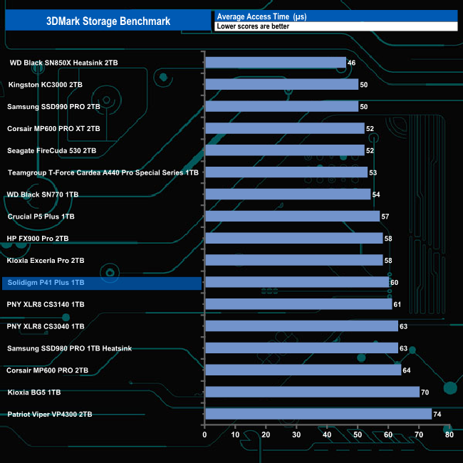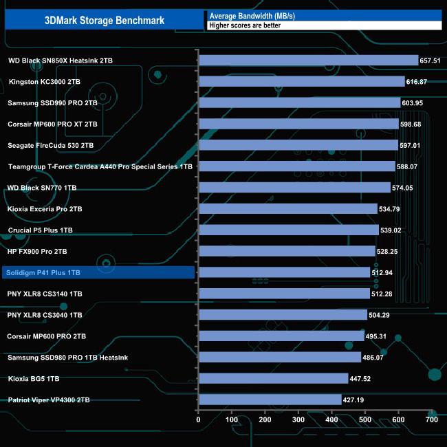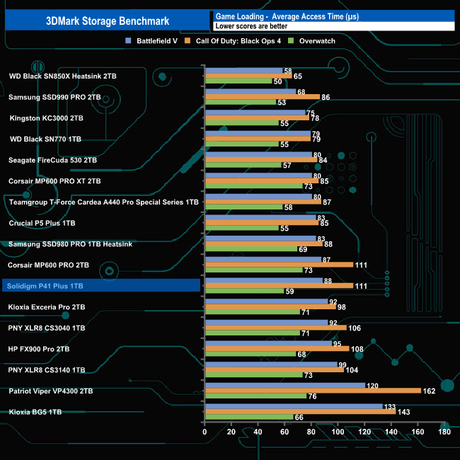 In 3DMark’s Storage Test, the 1TB P41 Plus had an average bandwidth figure of 614MB/s for the three-game load tests (Battlefield V, Call of Duty: Black Ops 4 and Overwatch) with an average access time of 86µs for the same three games.