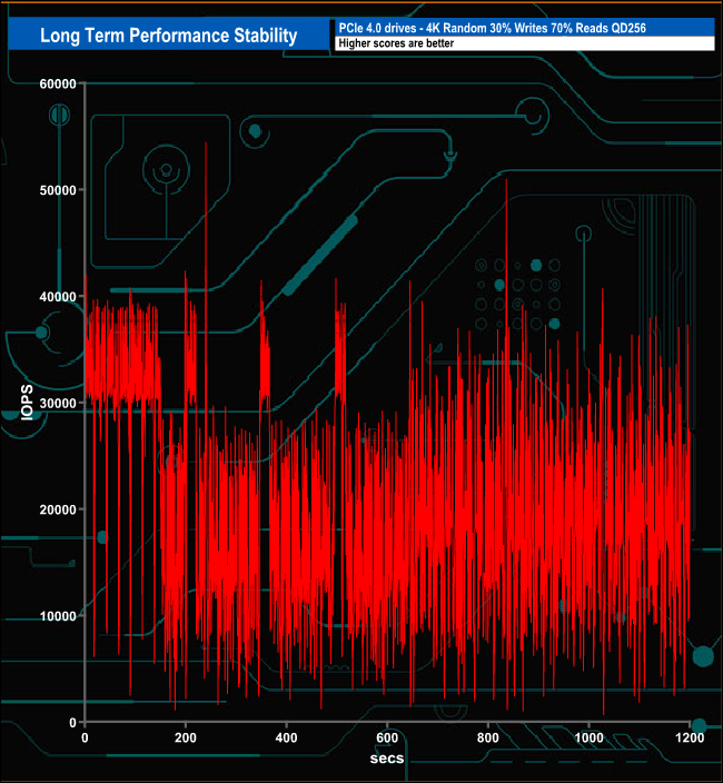 For the long-term performance stability test, we set the drive up to run a 20-minute 4K random test with a 30% write, 70% read split, at a Queue Depth of 256 over the entire disk. The 1TB P41 Plus averaged 20,105 IOPS for the test with performance stability of 51%.