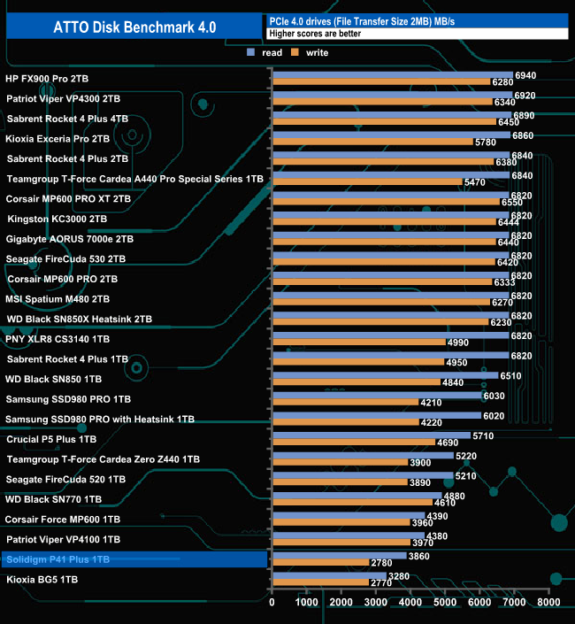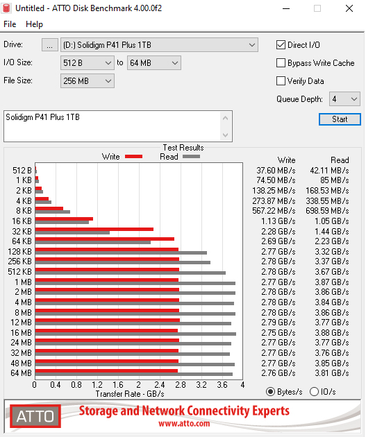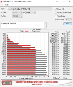 Using the ATTO benchmark, the best figures we got out of the drive were 3,860MB/s for reads and 2,780MB/s for writes, both short of the official maximums of up to 4,125MB/s and up to 2,950MB/s for read and write respectively.