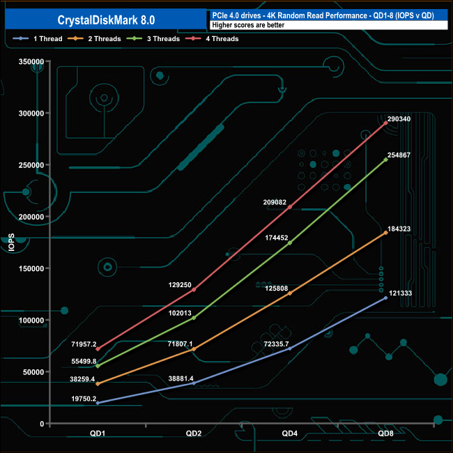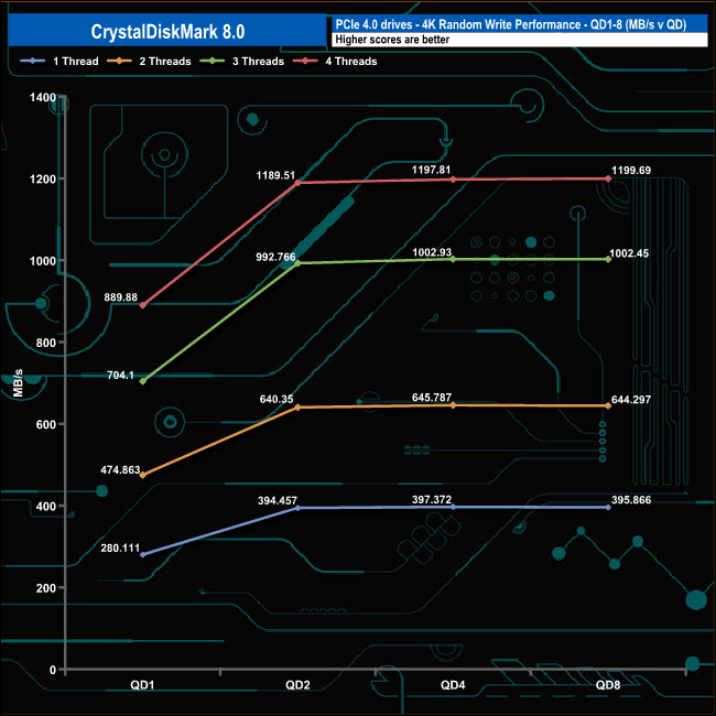 We used CrystalDiskMark 8 to test the random performance of the drive at lower queue depths (QD1 – QD8 where most of the everyday workloads occur) using 1 to 4 threads.