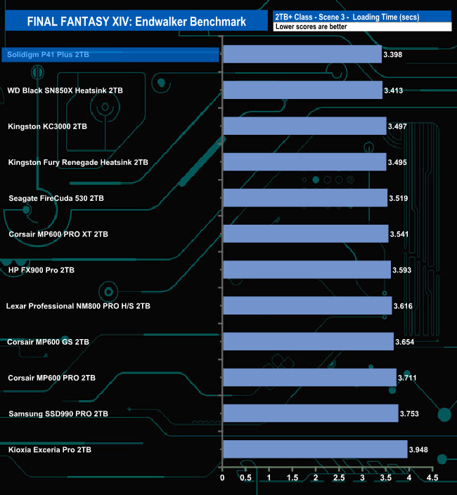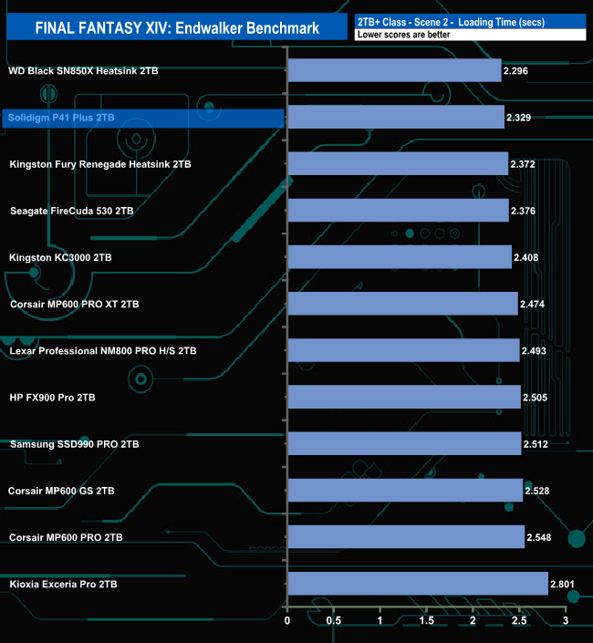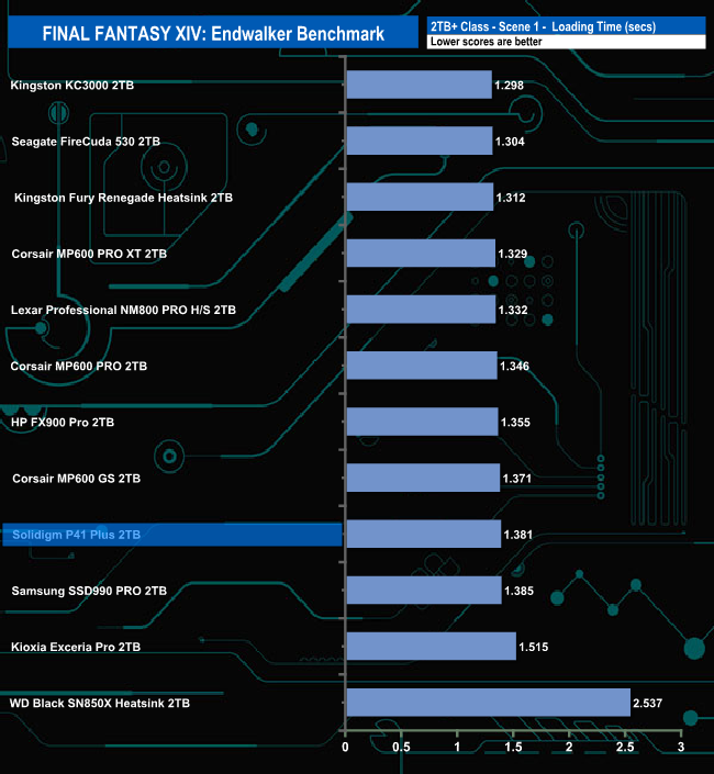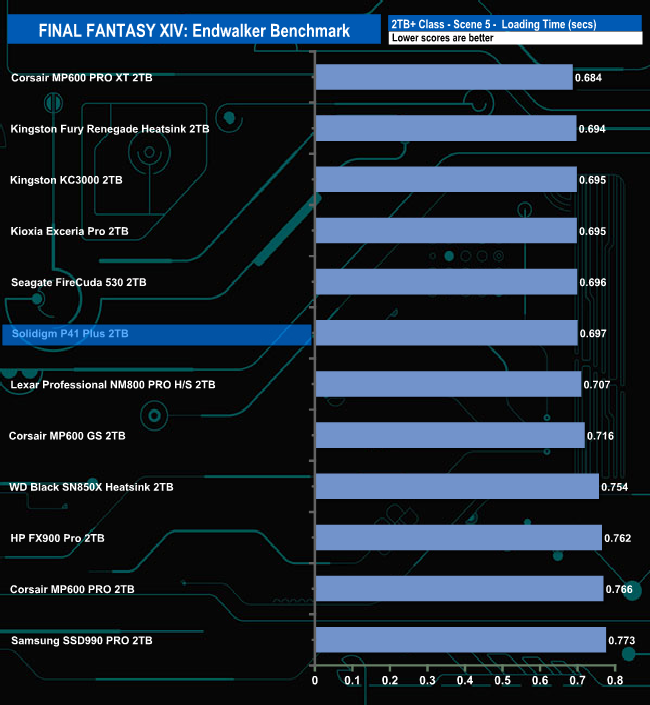 Solidigm's 2TB P41 Plus does very in the Final Fantasy XIV Endwalker Official Benchmark topping the chart with the fastest total load time we've seen to date. It also tops two of the other individual scene load timing charts as well.