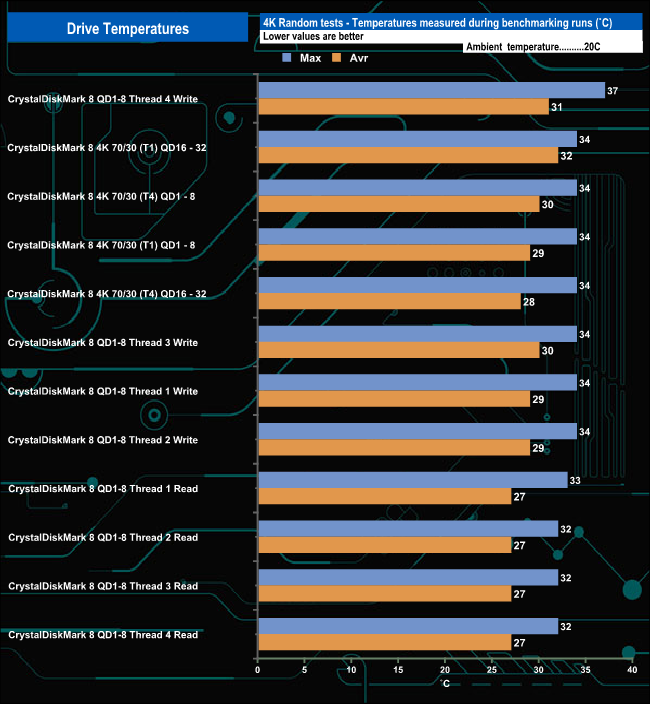 During the dedicated 4K random testing, the drive averaged 33.6° C. The hottest the drive got under this series of tests was the 37° C seen during the QD1-8 write test using 4-threads.