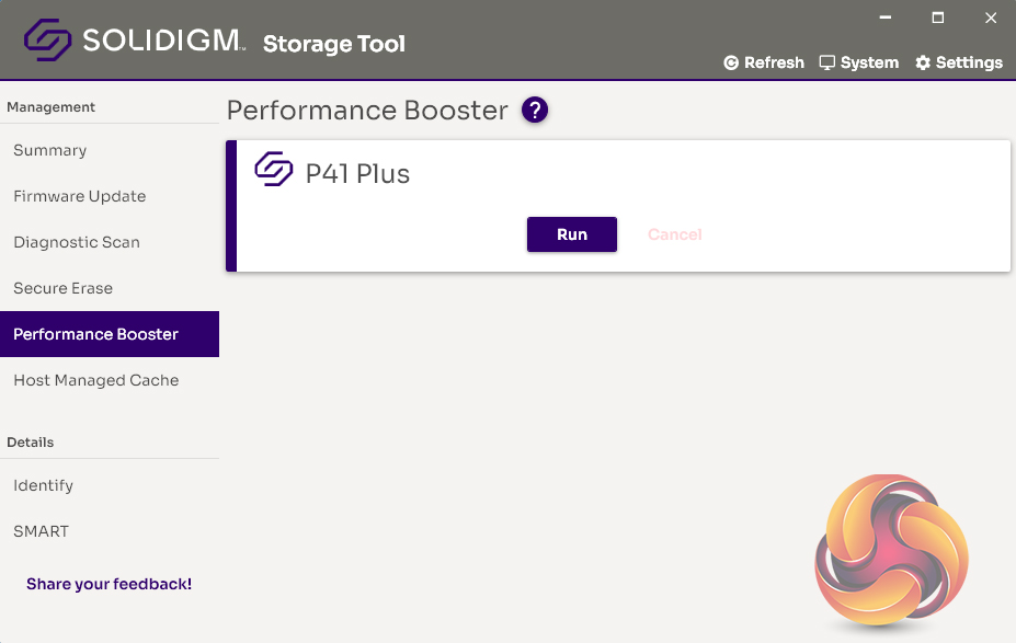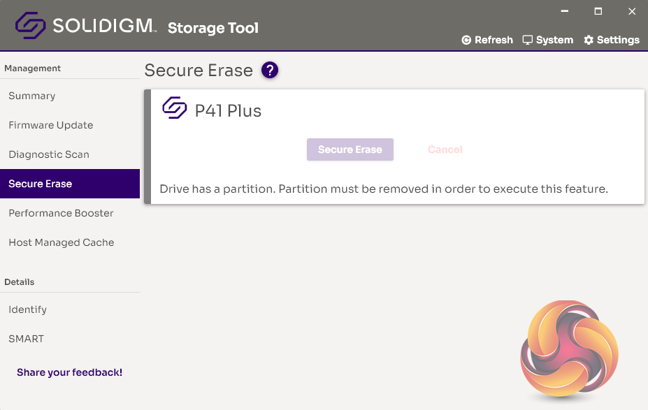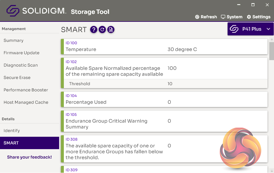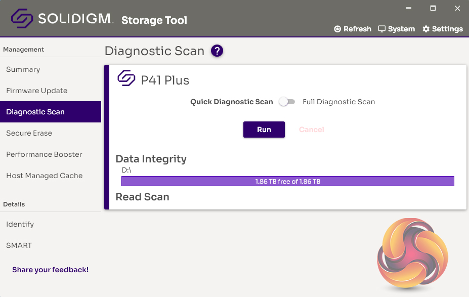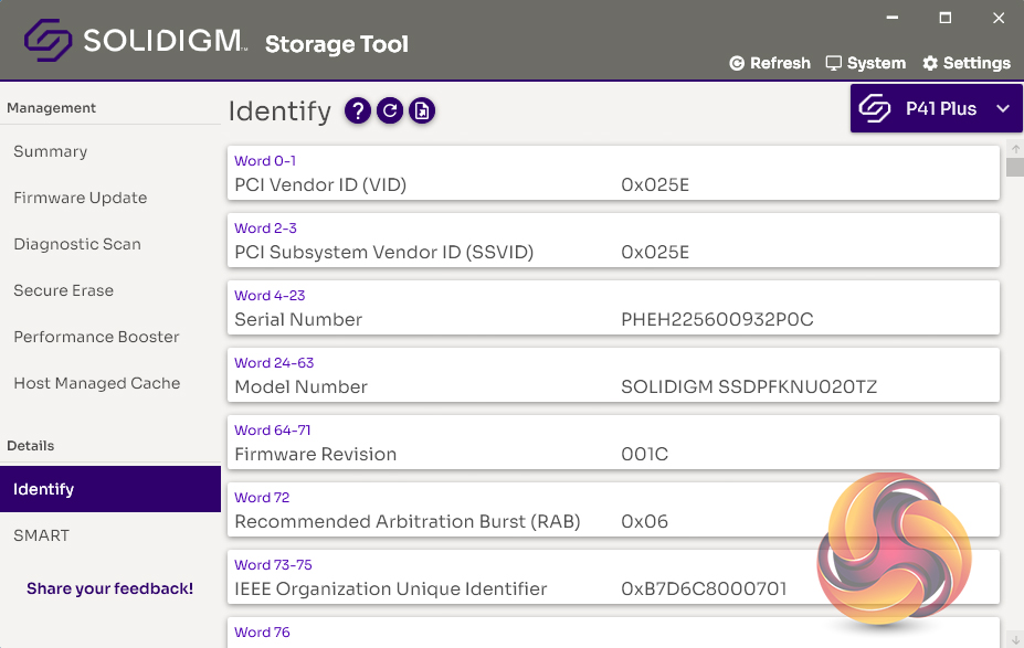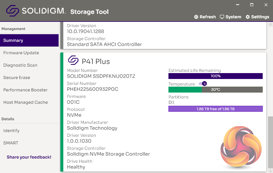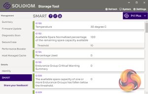Solidigm's software utility goes by the name of the Solidigm Storage Tool. It doesn't have the flashy GUI of some of its competitors, but most of what you need to keep a drive in shape is there including; drive information, drive health, diagnostic scans, firmware updates and secure erase. It has two sections Management and Details.