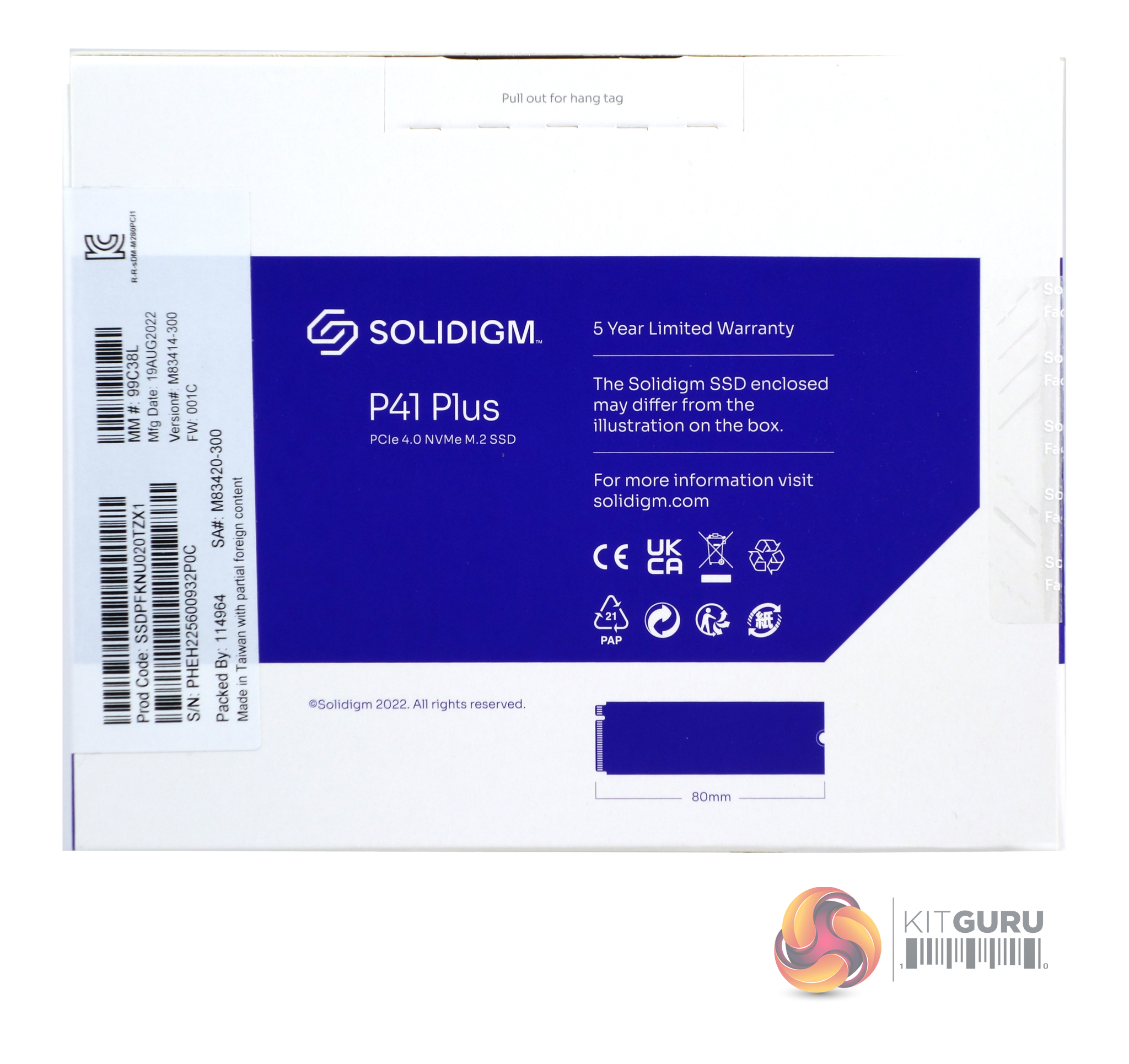 The Solidigm P41 Plus comes in a small but sturdy box with a close-up image of the drive on the front. To the left of the image is a sticker carrying the drive's size and its Sequential read speed rating (up to 4,100MB/s). On both the front and back of the box is a description of the format and architecture of the drive. Also on the back of the box is a statement that the drive has a 5-year warranty. Towards the bottom edge of the box, there is a small diagram showing the drive's length.