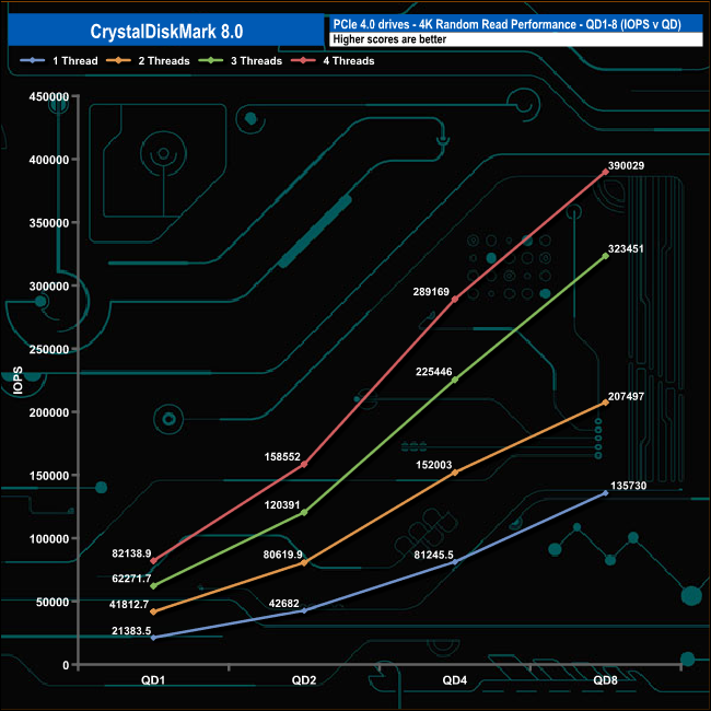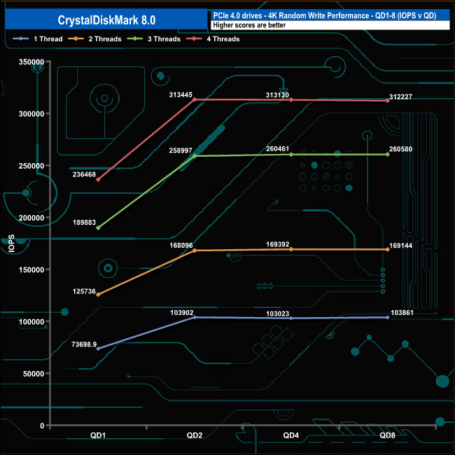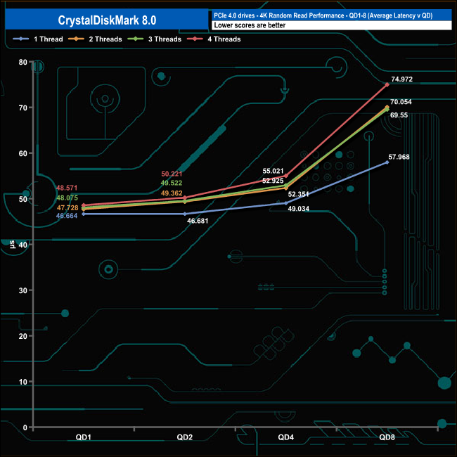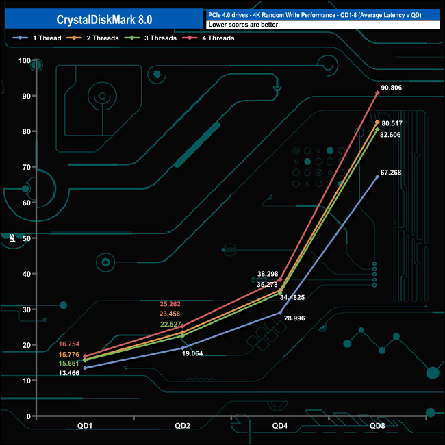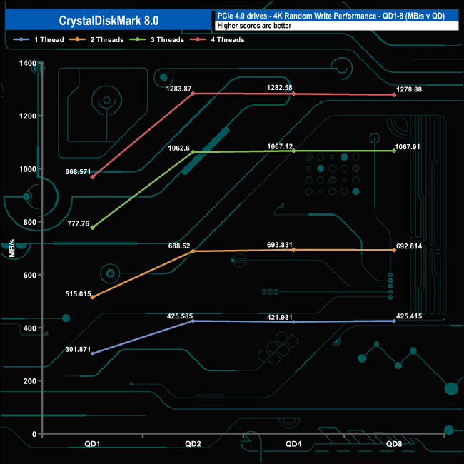 We used CrystalDiskMark 8 to test the random performance of the drive at lower queue depths (QD1 – QD8 where most of the everyday workloads occur) using 1 to 4 threads.