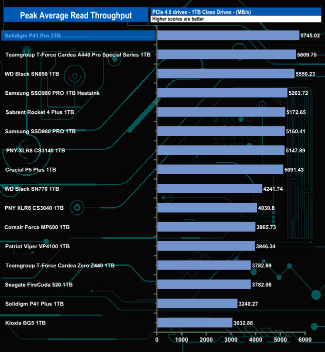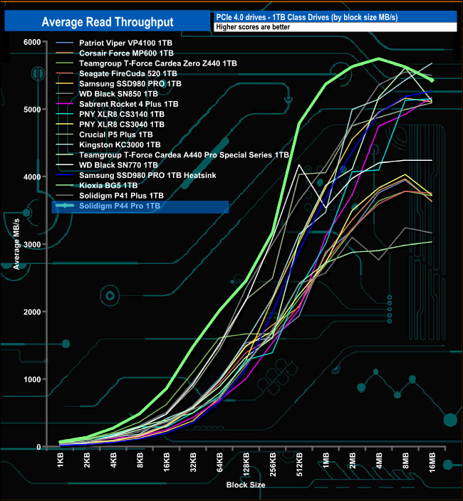 In our read-throughput test, the 1TB P44 Pro peaked at the 4MB block mark at 5,745,02MB/s before falling back to finish the test run at 5,429.76MB/s. Although the peak read figure falls well short of the official maximum of 7,000MB/s, it is still the fastest we have seen to date for a 1TB class consumer NVMe SSD.