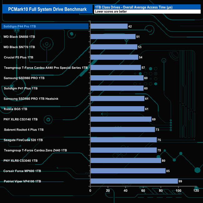 The 1TB P44 Pro sailed through PCMark 10's Full System Drive Benchmark without any problems. It averaged 292MB/s for the six Adobe start-up test traces, with the Premier Pro setup trace fastest at 328MB/s. The average for the five usage traces was 549MB/s, helped in no small part by the 1,184MB/s result for the Adobe Photoshop heavy usage trace.