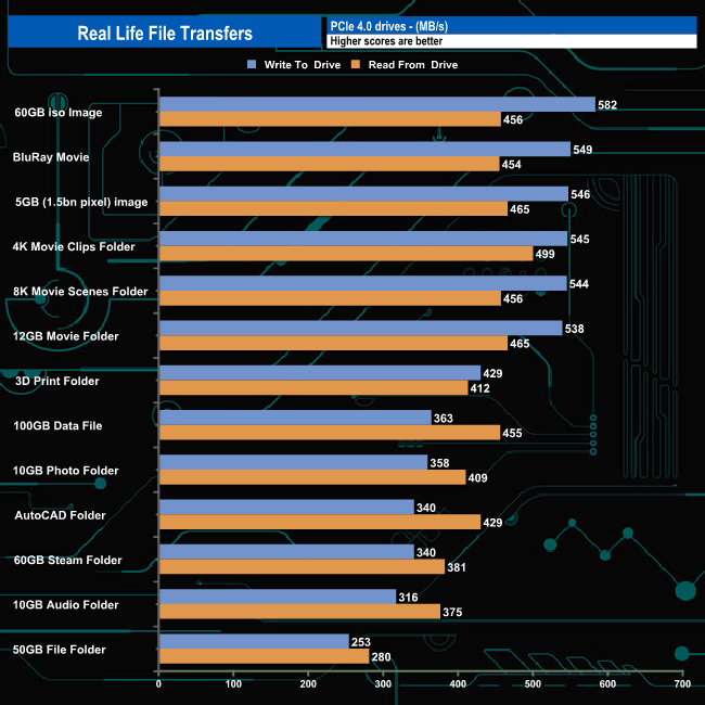 Solidigm's P44 Plus averaged 550MB/s for writes when dealing with the larger file size transfers and 465MB/s when reading the data back. However, It's not quite as efficient when dealing with smaller file sizes, averaging 299MB/s for writes and 391MB/s for reads. As normal, the 50GB file folders are the slowest; 253MB/s writes and 280MB/s reads.