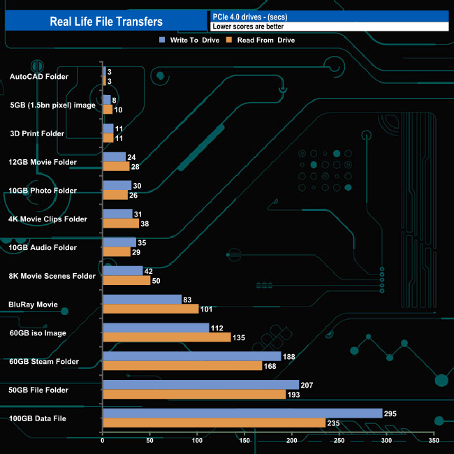 To test the real-life performance of a drive we use a mix of folder/file types and by using the FastCopy utility (which gives a time as well as MB/s result) we record the performance of the drive reading from & writing to a 256GB Samsung SSD850 PRO.