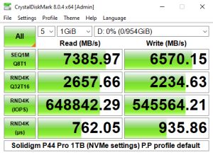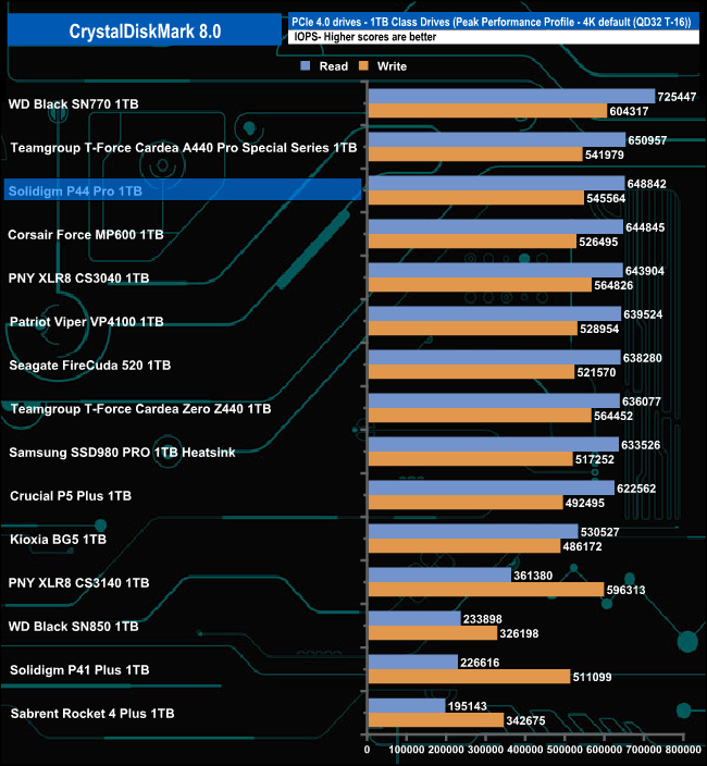 The Performance Profile result screen also includes a 4K IOPS score. The Solidigm P44 Pro produced test results of 648,842.29 IOPS for reads and 545,564.21 IOPS, way off of the official 1,400,000 IOPS / 1,300,000 IOPS (reads/writes) but still good enough to put the drive into third place in our results chart.