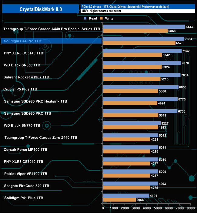 Looking at the benchmark result screens we can confirm the official Sequential figures for the drive of 7,000MB/s and 6,500MB/s for reads and writes respectively with a best-read result of 7,403MB/s (0 fill) while the fastest write speed we saw was 6,603MB/s (0 fill).