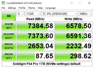 The P44 Pro performs well in CrystalDiskMark's 4K QD1 (single thread) test. With a read score of 87.65MB/s, it sits just behind WD's Black SN850 at the top of the results chart, but with a better write result than the WD drive.