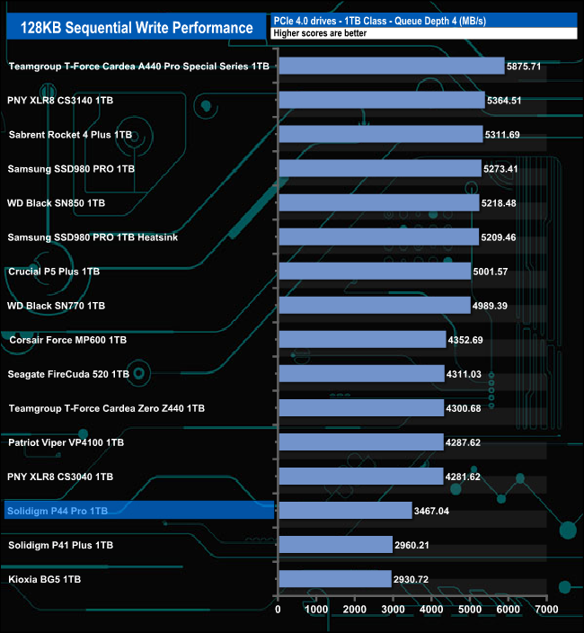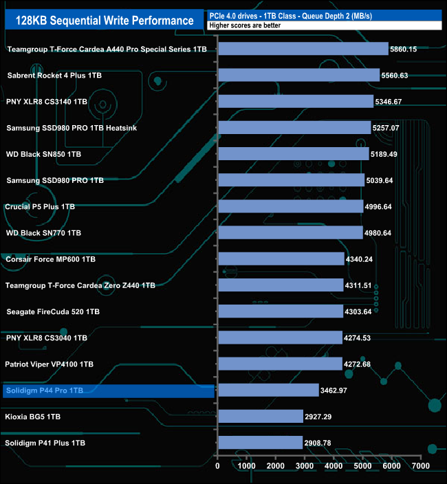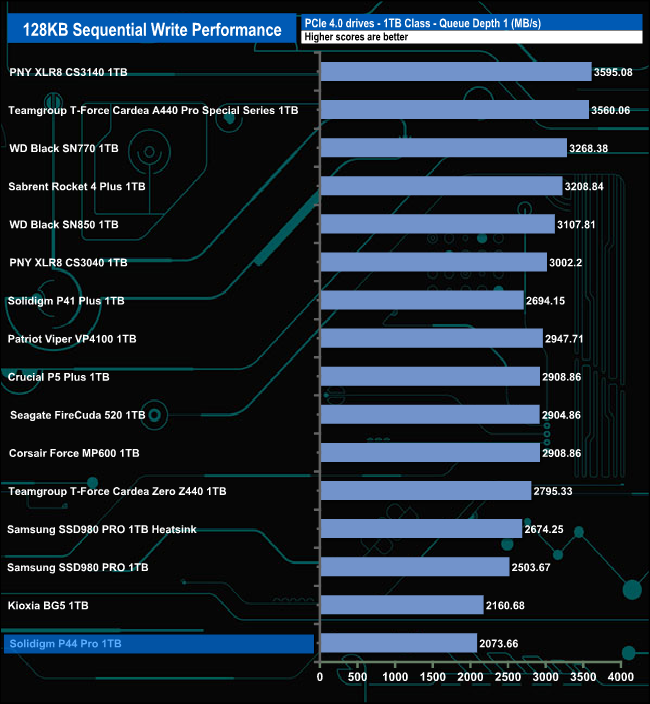 When it comes to our Sequential write tests, the drive's performance at lower queue depths is nothing to write home about but at QD32 the drive seems to come alive, its test result of 6,582.69MB/s not only confirms the official maximum of 6,5000MB/s, it is also the fastest Sequential write performance for a 1TB class consumer drive we've seen to date.
